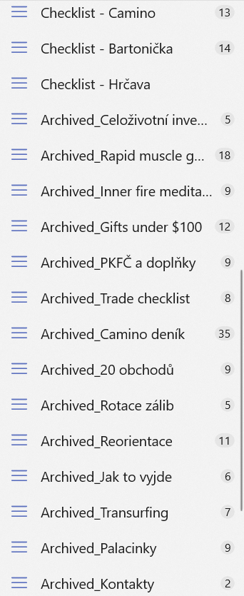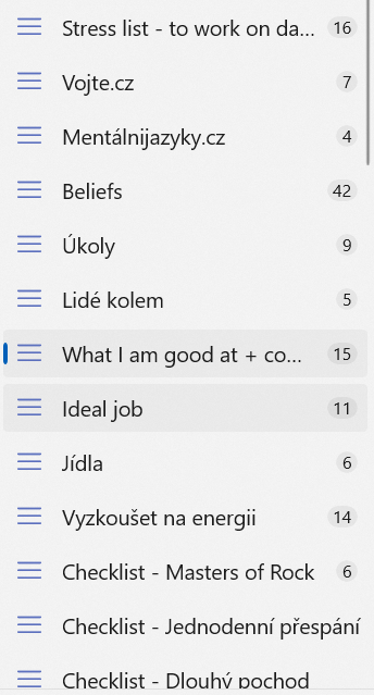 Mám seznamy na řešení, seznamy mých předvědčení, seznamy věcí co beru s sebou na delší pobyty, už nepoužívané seznamy…